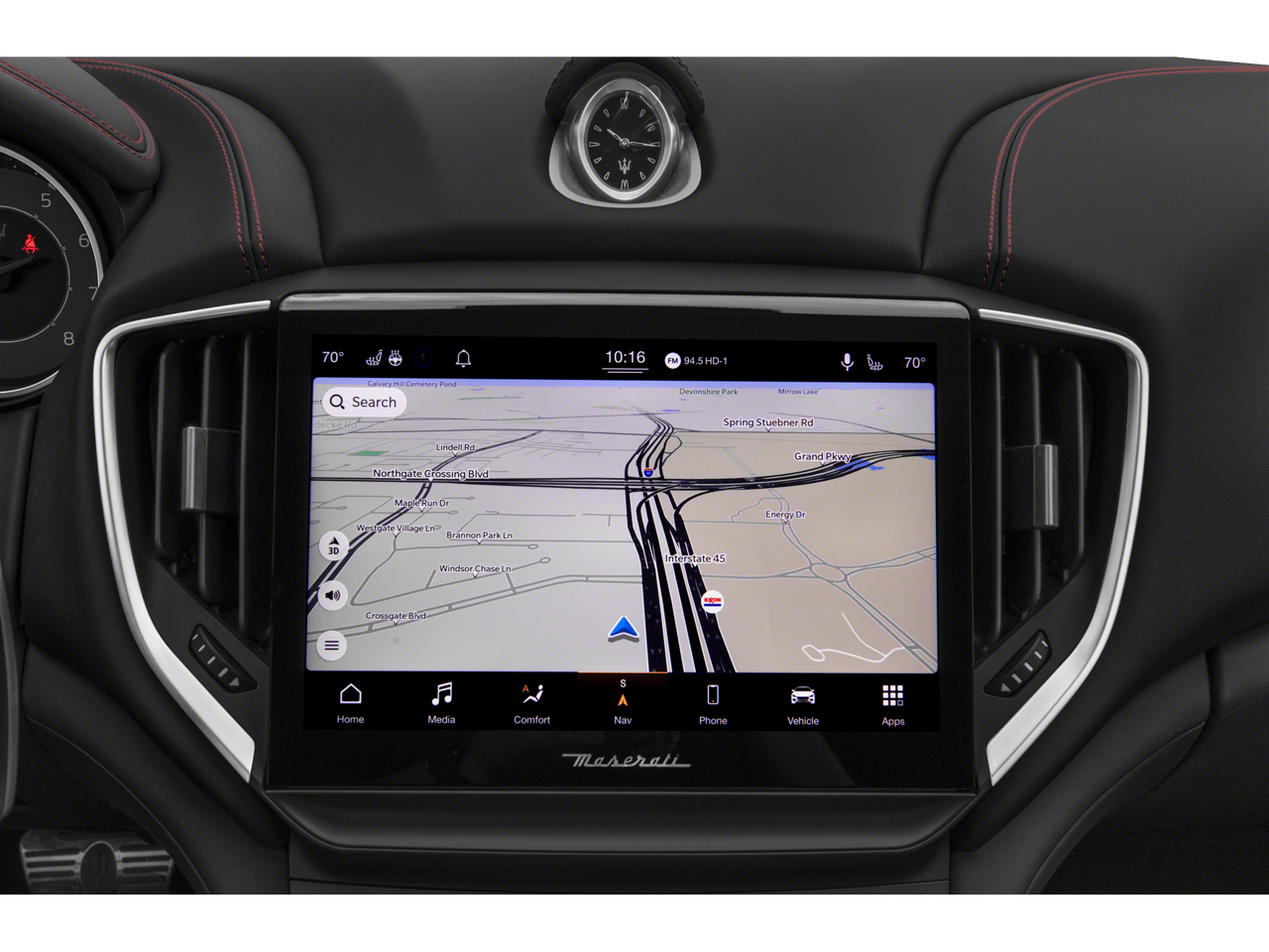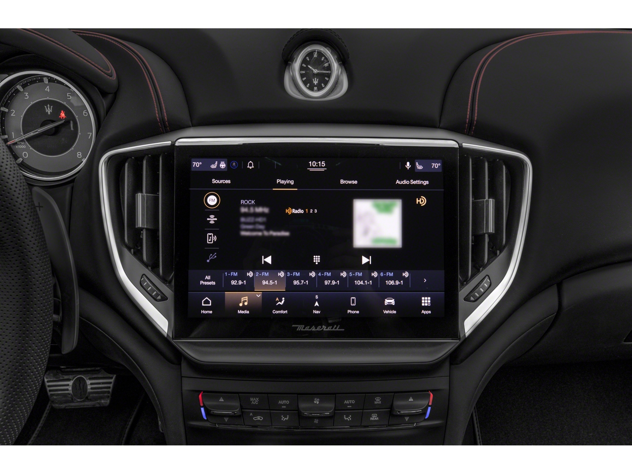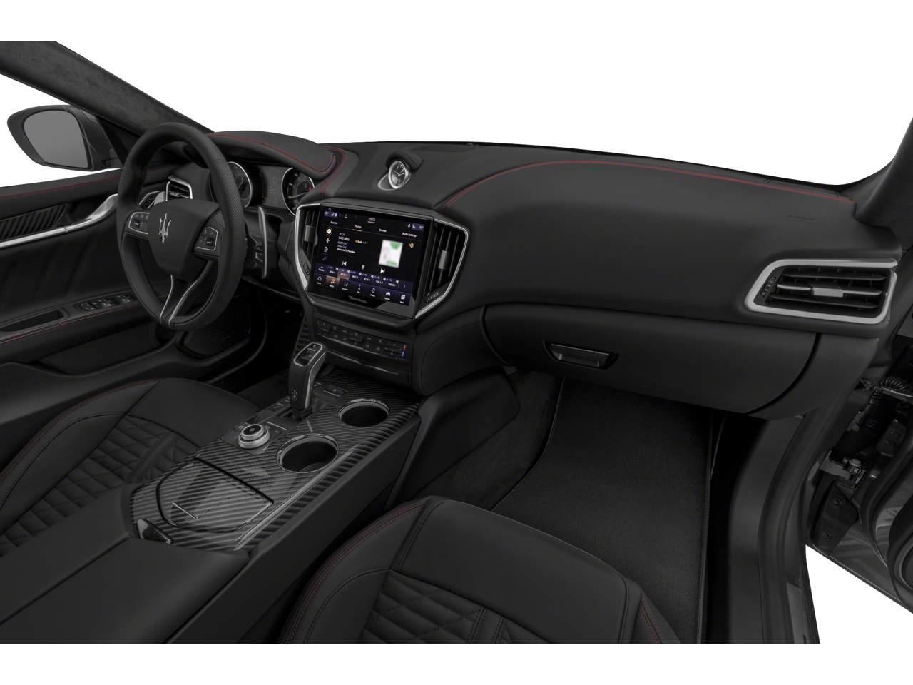 - Radio: AM/FM con Maserati Intelligent Assistant, que incluye: pantalla táctil de 10,1 pulgadas, navegación, radio HD, radio por satélite SiriusXM (suscripción de prueba de 1 año), lector de tarjetas SD, USB, entrada auxiliar, compatibilidad con Apple CarPlay y Android Auto, funcionalidad Bluetooth®, controles de climatización, actualizaciones OTA, asistente de voz Alexa integrado en el vehículo, eCall y bCall, control de diagnóstico remoto, servicios de navegación y tienda de aplicaciones